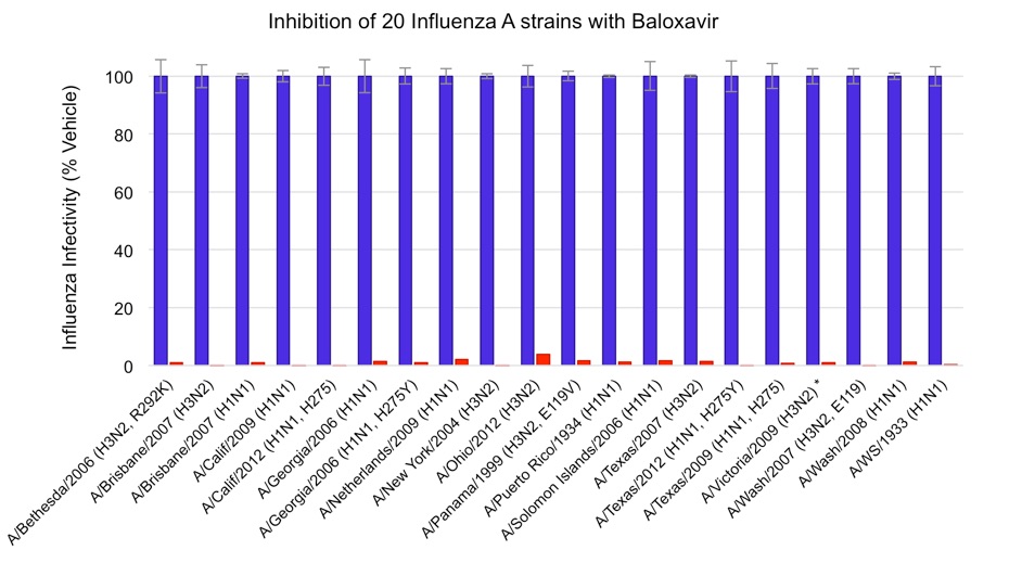 Replication of 20 influenza virus strains in A549 cells in the presence or absence of antiviral Baloxavir. The extent of infection is indicated as a percentage of vehicle control. Raw OD values from mock-infected cells were subtracted from all data points. Standard deviation of duplicate vehicles from each influenza A strain are shown.