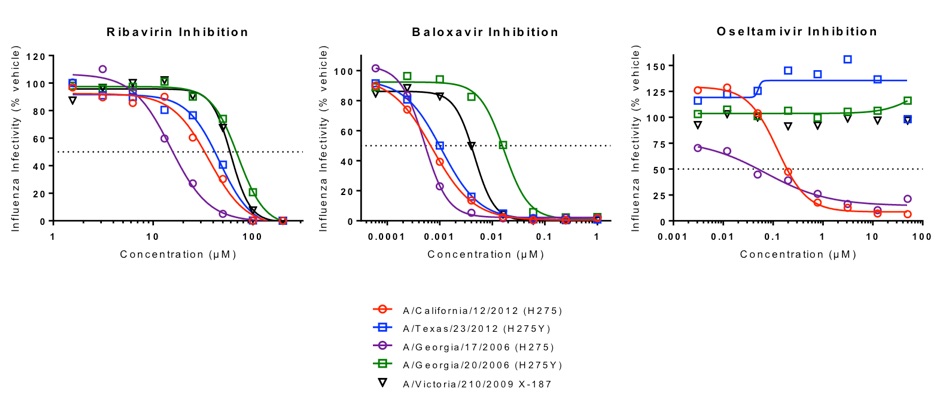 Inhibition of five representative Influenza A strains. Infections in the presence of ribavirin, baloxavir, or oseltamivir were monitored in A549 cells infected with five representative Influenza A strains. The extent of virus replication is indicated as a percentage of vehicle control. Data was adjusted to a sigmoidal function in GraphPad Prism.