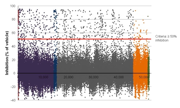 RetroVirox has successfully screened over 200,000 small molecules in four different HTS campaigns (funded by NIAID SBIR awards) with live viruses utilizing a variety of readouts. Several of these campaigns have resulted in the generation of validated leads against novel targets and at now at the medicinal chemistry optimization stage. RetroVirox has broad experience optimizing phenotypic cell-based assays from the scratch and validating them with pilot assays of a few thousand compounds to determine the feasibility of the campaign (signal to background, variation and Z’ values) and set the criteria for hit identification. Among the readouts typically used are high content (flow cytometry), fluorescence, luminescence , colorimetric, and cytopathic effect (CPE) readouts. An example of a 55,000 molecule campaign carried out at RetroVirox against arenaviruses is shown below.